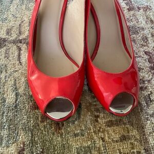 Gorgeous patent sling backs with open toe. Worn twice and in excellent condition. The colour is a stunning orange/red / size 7.