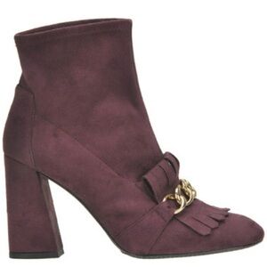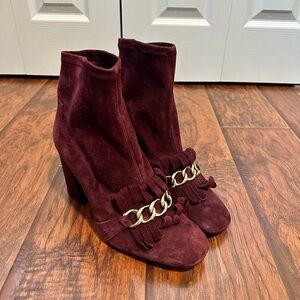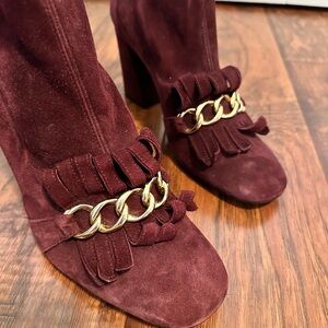 Stuart weitzman burgundy red ringleader fringe chain heeled chunky boot