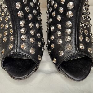 Black open toe high heel booties covered in silver metal studs with spider zipper sides, by Material Girl.