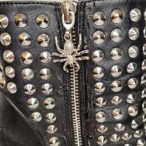Black open toe high heel booties covered in silver metal studs with spider zipper sides, by Material Girl.