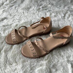 Leather straps with leather footbed. Some small cosmetic marks from where some foam padding was added on the footbed.