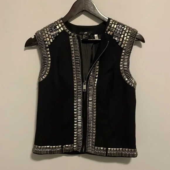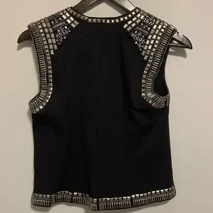Stylish studded vest with zipper closure. Lined. No pockets. Approx 18 3/4” from top of collar to bottom hem