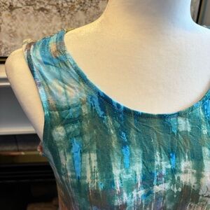Vibrant sleeveless dress with a multicolor pattern. Features shades of blue, purple, and green. Can be a beach cover up, silky and lightweight, pit to pit 18 inches, 30 inches in length
