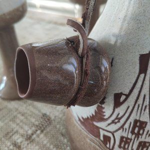 Set of 5, La Canadienne Studio Art Pottery, Quebec, Canada Decanter Bottle and 4 Goblets Cups, Glasses Chalices. Speckle Glazed with Etched Graphics on fronts, stopper attached with Leather cord. Decanter is 11.75 inches in height and 6 inches at its widest, Chalices are 7 inches in height, 3.5 inches in diameter at its Rim and 3.25 inches in diameter at the base. Very Good Vintage Condition, no chips, no cracks, no crazing, Decanter has a production fault at the rim shown in photos. Please see pictures for further details