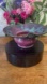 This striking handmade studio pottery ikebana bowl features a flowing drip-glaze pattern in deep plum, indigo, and teal tones. Designed for floral arranging, it includes a built-in metal kenzan (flower frog) for easy stem placement. The organic rim and smooth glaze transitions make this piece as much a work of art as it is functional pottery. Signed "JB" on the base, it's a beautiful example of mid-to-late 20th-century artisan craftsmanship.