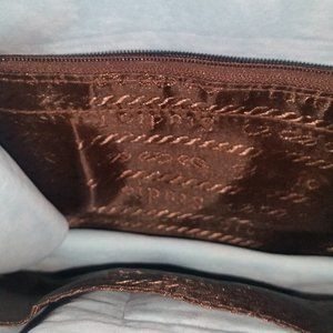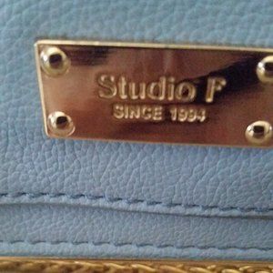 Studio F powder blue crossbody bag with gold hardware. Measures 8 x 8 x 3 1/2 inches. Zipper interior with pocket. EUC