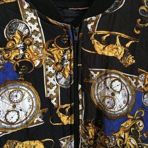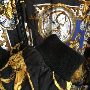 Good preowned condition, vintage 80s/90s, quilted bomber in black, with black banded collar, waist and cuffs, featuring a lion, pocket watch and rococo architectural elements in goldish tones, blue, white. I believe it is by designer Studio J. Unique and rare. There is some stitching pulled here and there, but it could easily be repaired. Usually this sells for 150ish, but the price is lowered because of this.