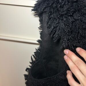 Super fluffy and furry has like hook clips for closure no pockets