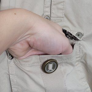 Studio Mode Womens Utility Jacket Off Center Button Khaki Tan Stretch Pockets Cargo Pockets Full Zip Casual