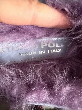 Soft fluffy lavender purple shearling. Visible Studio Pollini label. Luxurious textured finish. Statement outerwear piece.