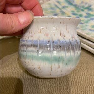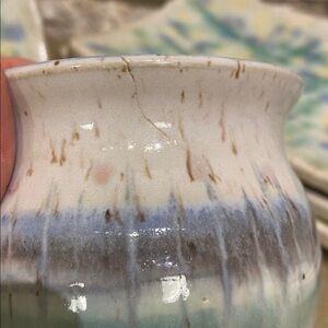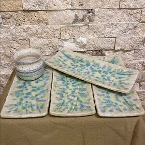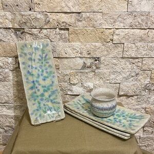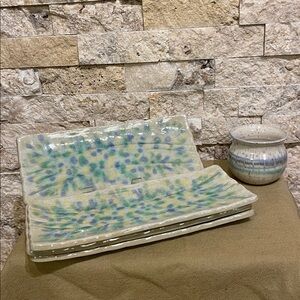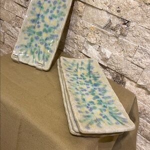 Four rectangular plates can be used for a variety of things. Paired with a small dish (hairline crack).