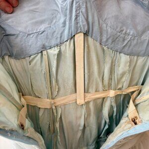 Handmade with intricate details, this ball gown exudes elegance and charm, perfect for a special party occasion. The sea foam blue color and timeless design make it a standout piece from the 1950s era, adding a touch of vintage glamour to your wardrobe. This gorgeous dress has 2 very generous layers of tulle, one layer of soft mesh and a blue silk lining.It is breathtakingly beautiful and put together expertly by an obviously expert seamstress. The sweetheart bust is nicely shaped Some minor snags but not at all visible.