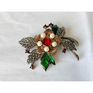 A very Stunning Avon Red Rhinestone Enamel Flower Brooch. This exquisite piece is perfect for adding a touch of elegance and glamour to any outfit. Made with high-quality materials, this brooch features a striking combination of red, green, silver and gold colors, accented with shimmering marcasite and faux pearl details.
