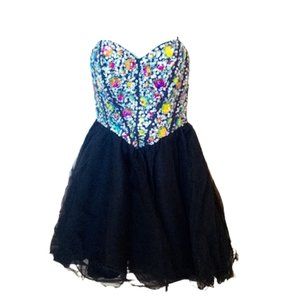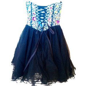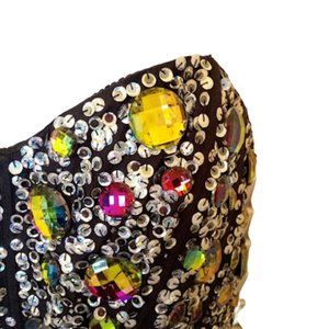 Drop dead gorgeous drees that is certain to turn heads at Prom or any formal event Rhinestones and other decorations make this dress genuine Eye Candy Ties in the back like a corset Used once. In excellent condition Note that thee are no straps. What you see are the strings to hang it on a hanger