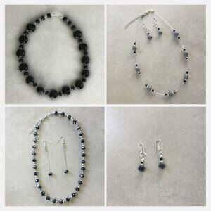 Elevate your style with this exquisite set featuring a combination of black, silver, and pearl designs, carefully crafted to create an elegant and sophisticated look. Whether you're dressing up for a special occasion or adding a touch of glamour to your everyday ensemble, this versatile jewelry set has you covered. The collection includes a stunning black and silver beaded necklace, a coordinated grey, black, and silver pearl necklace with matching earrings, and a striking black beaded necklace, offering a variety of options to suit your unique style.