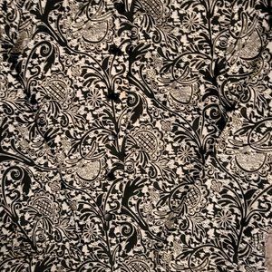 51% Rayon, 39% Polyester, 20% Metallic. Lining 100% Polyester. Dry Clean Only.