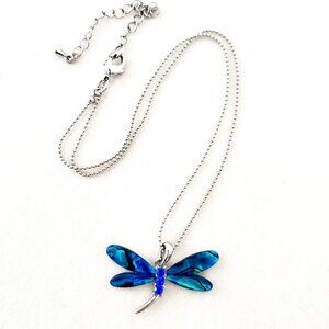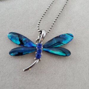 Stunning Blue PAUA SHELL Dragonfly Pendant Necklace Silver Tone Bead Chain