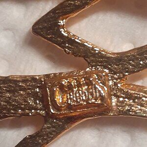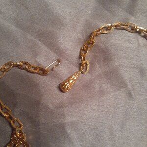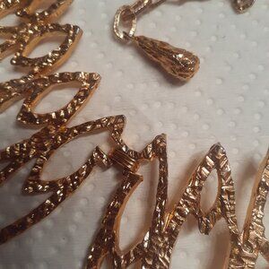 Gorgeous gold tone vintage 60's Cleopatra style bib necklace from Celebrity NY. Rare statement piece with adjustable hook. Brand New, never worn inherited from family. Details are beautifully designed..heavy quality piece . Approximately 17.5 " in length from chain end to end, center of bib is 4" long, bib measures 8" across at points. Bib is in 3 pieces attached by hinges, making necklace articulated.
