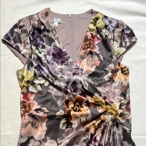 Stunning Floral Dress Grey Satin Cap Sleeve sz 12 like new