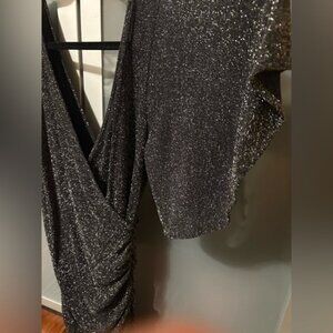 Chic black dress with shimmering sparkle details. Features flowy sleeves and a flattering drape. Ideal for evening occasions.