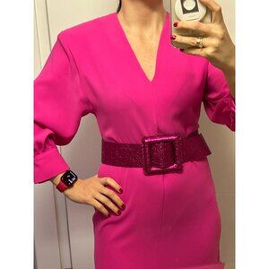 Made in Italy, this elegant fuchsia pink dress with V-neck and chic three-quarter sleeves. this dress comes alive with its metal belt and square buckle detail.