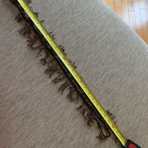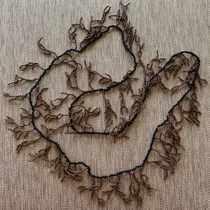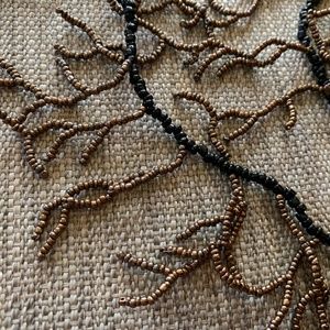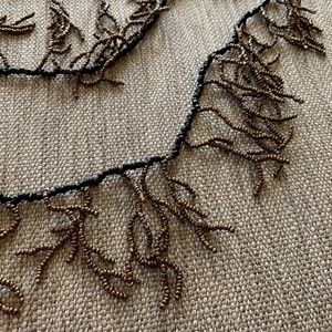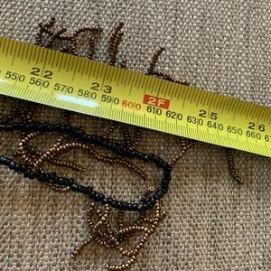 Unique is definitely what this necklace is! It’s hand crafted, hand beaded, black main strand with metallic brown “twig-like” suspended hanging bead pieces all around the full length. This can be wrapped twice as a necklace, & multiple wraps as a bracelet. It is a full 48” diameter.