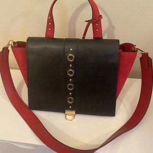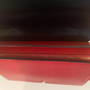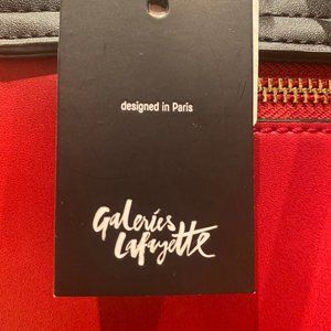 New with tags Styled in Paris Red, Black with gold accents. Removable shoulder strap. Back zippered pocket. Internal pockets. Designed in Paris, Galleries Lafayette.