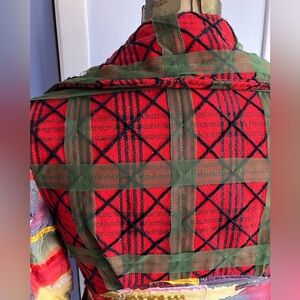 This Exquisite Blazer has a stunning patchwork design. The main body is made of plaid weaved fabric with overlay black & green ribbons.