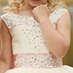 Beautiful ivory tulle and lace special occasion dress with small train and blush pink satin sash. Excellent/Like New condition, worn once and cleaned immediately afterward. Your little will feel like an absolute princess!