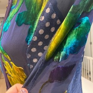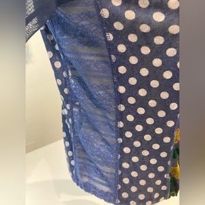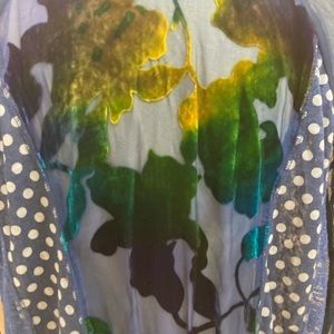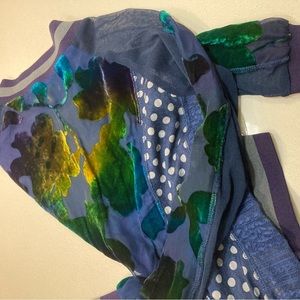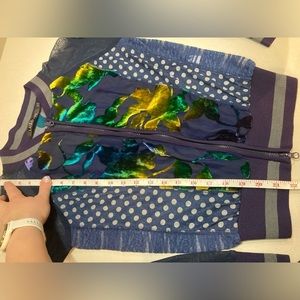 Gorgeous jacket! Mesh with lace panelling and a polka dot side panel, elastic collar and hem, zipper front. Velvet appliqué floral design.