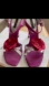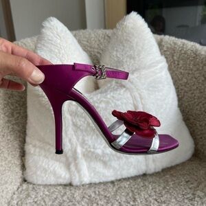 Magenta-silver satin and leather, with a delicate floral applique attached. These are come with an ankle strap, silver-toned hardware, and pointy heels.