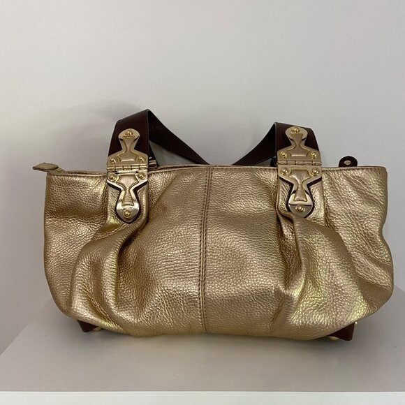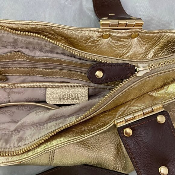 Stunning Michael Kors Gold Metallic Leather Satchel Brown Straps & Gold Hardware