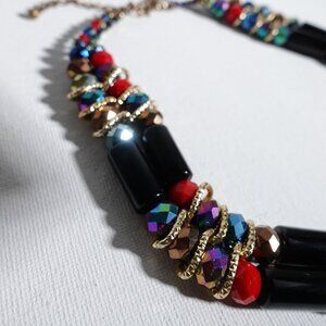 Stunning necklace and earrings set. This unique piece features a dazzling array of colorful glass beads, including striking red, black, and iridescent hues, intricately woven together with gold accents.