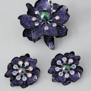 This is a stunning statement, Joan Rivers brooch pin and matching earring set. The three-dimensional flower brooch and matching earrings are full of shine and bling, featuring purple glitter petals, aurora borealis rhinestones, and a center faux black pearl. This beautiful, large brooch is perfect as a coat brooch. The Joan Rivers mark is on the back of the brooch and earring backs.
