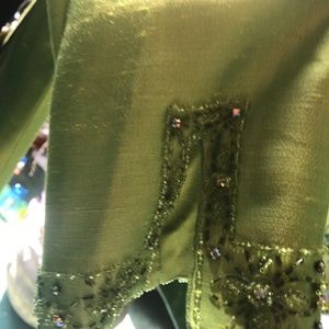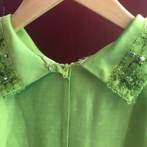 This mid-length party dress is a showstopper. Fabric is lime-green thick raw silk, with incredible beadwork and crystals at the sleeves, neck and front. It is in great shape. Designer label "Star" from Toronto - not sure what era it hails from but it is definitely vintage.Would be an amazing formal evening dress or for a holiday party or wedding. Sized petite - about an 8-10.