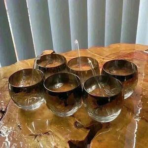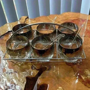 Gorgeous set of 6 Rolly Polly glasses and caddy. I am not sure if they are Dorthy Thorpe, but same style. Each glass is about 4" tall, with a wide silver band and an etched Leaf Motif. Comes in an easy to carry caddy and 3 lucite stir sticks. These are in excellent condition.