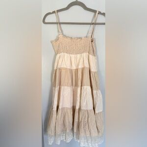 Chic tiered dress in beige and cream. Perfect for casual outings.