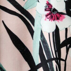 Beauitful pink with colourful floral design and contrasting black piping around the collar and sleeves makes this dress pop.