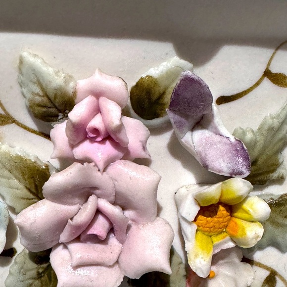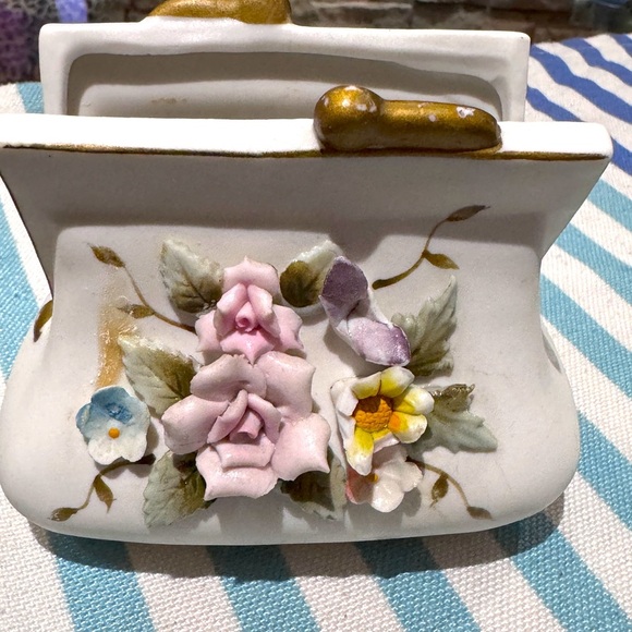 Add charm to your home with this vintage ceramic piece, shaped like a classic handbag and adorned with hand-painted 3D floral accents.