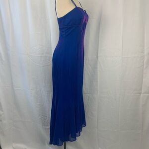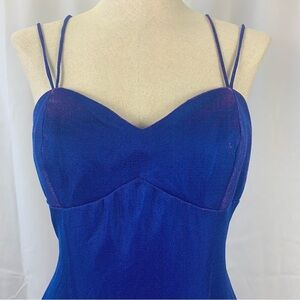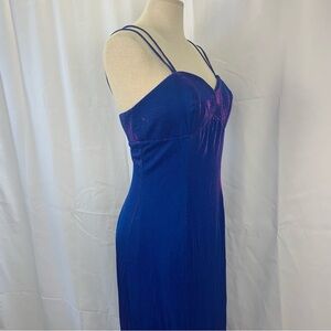 This gorgeous dress is quintessential 90s fashion with a whimsigoth feel. The dress is fully lined, features blue material that shifts to pink, a sweetheart neckline with spaghetti straps, zip closure, and a soft mermaid flare at the hem. No material content tag.