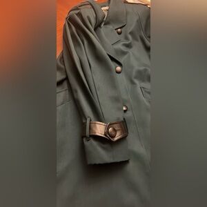 Stunning Vintage Irving Posluns Women’s Forest Green Wool Trench Coat with Leather Detailings. Leather buttons, wrist cuff straps and leather epaulettes. Sleeves are very full with pleats. Quality satin lining. Sash belt. A truly beautiful and unique quality coat - pictures don’t do this beauty justice!