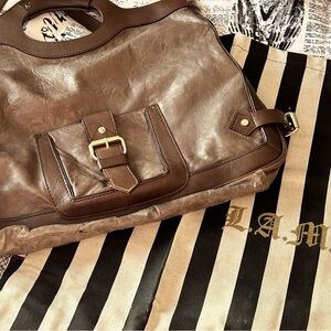 👜 Vintage Gwen Stefani L.A.M.B. Brown leather handbag with strap. Gold accents in the buckles and zippers. Lots of room for everything you need to carry everyday. Magnetic closing for the top part of the bag. Never used just sat in its dust bag. Great addition to everyday life!