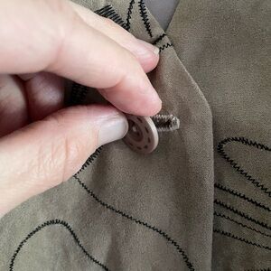 As with all vintage items there are signs of wear. In this piece the stitching around the button hole was coming loose. I have secured it as shown. The top button also needed to be secured. The tag was ripped out but damage is only shown on the lining.