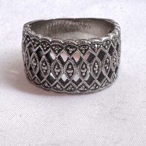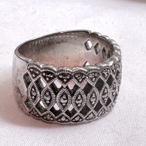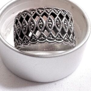 This stunning .925 sterling silver ring features an intricate woven lattice design with ornate detailing, creating a vintage-inspired, bohemian statement piece. The wide band style makes it bold yet comfortable, perfect for both everyday wear or special occasions.