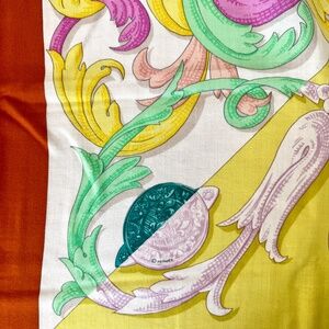 Beautiful and rare Hermes cashmere silk shawl in ‘le Mors a La Conetable’ design. Designer is Henri D’Origny. Made in France, and hand rolled so the 140 cm by 140 cm varies ever so slightly scarf to scarf given this. This shawl exudes elegance and sophistication, and the colour scheme coordinates with so many outfits - whether spring, summer fall or winter.