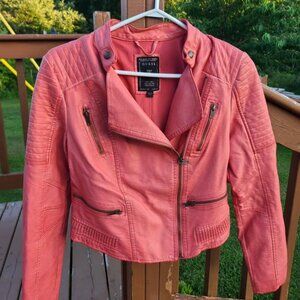 Gorgeous pink moto jacket by Guess. Perfect for spring to throw on over jeans and a white tee. The shade is a salmon/coral type pink. This jacket is so incredibly cute! Loaded with stylish extras, it's the perfect shade and style to take you into spring and summer. Pair with denim or throw on over your summer maxi dresses. This jacket would look gorgeous amongst pink and orange flowers for a photo shoot. Size small. Dm to purchase.