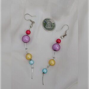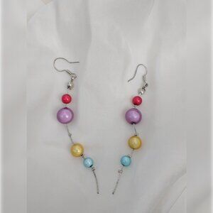 Pair of beaded earrings. Each earring has 4 beads of different colors: red, purple, yellow, and light blue, strung on a silver-colored wire. The earrings have a fishhook clasp.