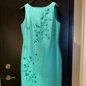 Absolutely beautiful Evan Picone!! A pure silk, jewel blue coloured, sheath dress decorated with embroidery and jewels.