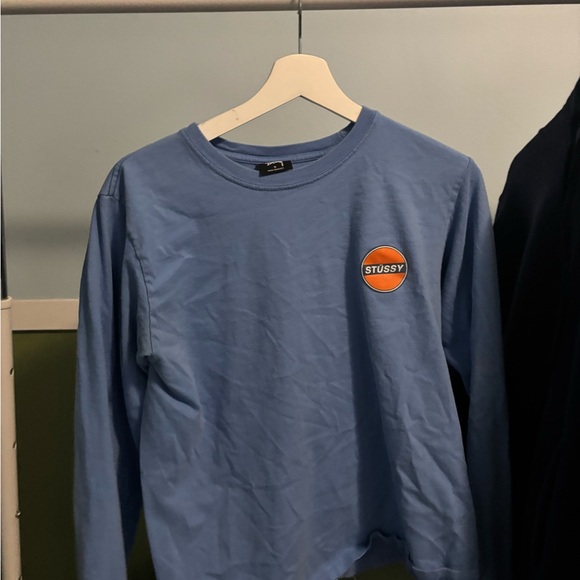 Stylish Stussy long sleeve tee in sky blue. Features iconic logo on chest. Ideal for casual outings.