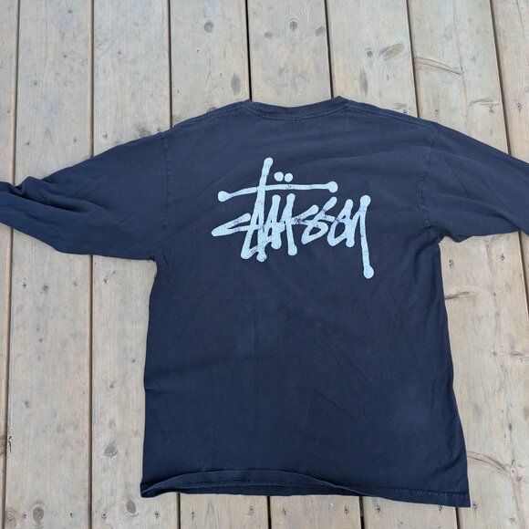 Add an iconic piece of streetwear to your collection with this classic Stussy long sleeve t-shirt. This men's size medium shirt is a timeless black pullover, featuring a bold graphic on the front or back that embodies the brand's legendary style. With a comfortable fit and a design that is perfect for any casual outfit, this shirt is a must-have for any fan of streetwear or someone looking to add a touch of cool, skate-inspired style to their wardrobe.